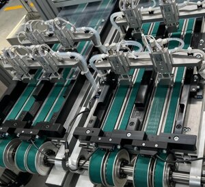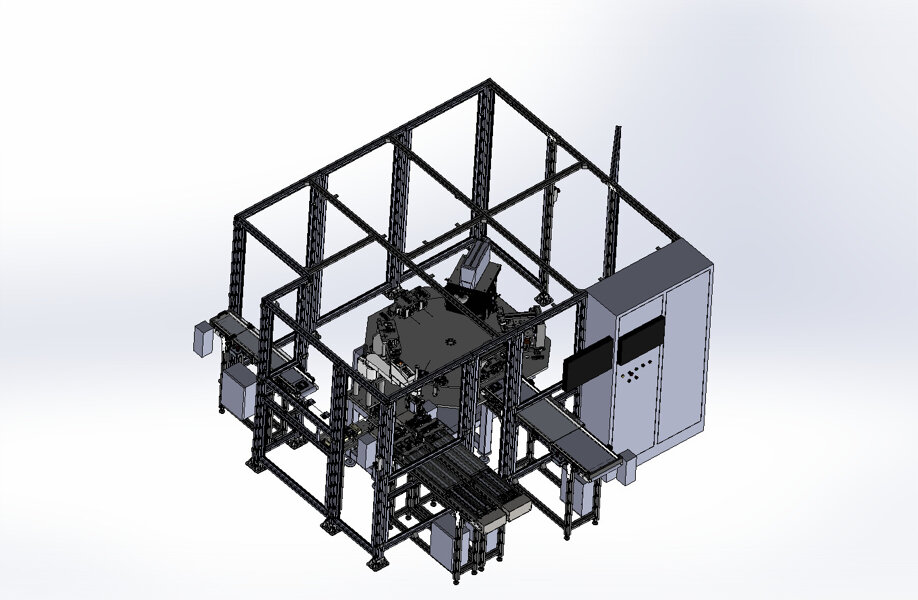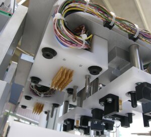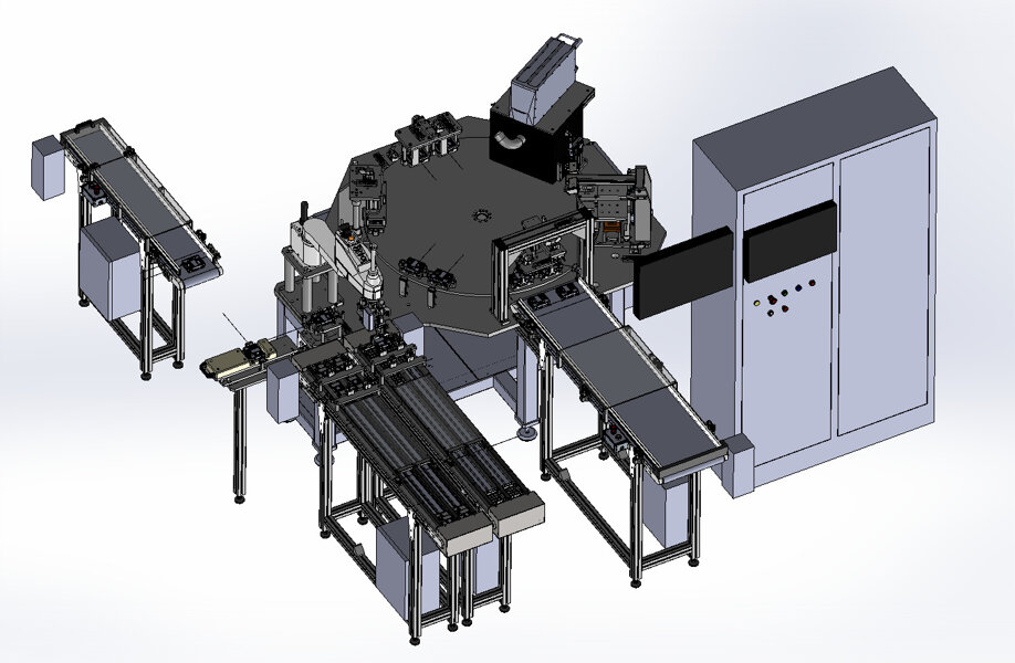 I corpi e coperchi sono inseriti manualmente su nastri di asservimento doppi con un buffer di x pezzi con posizionamento e maschere tali da evitare il posizionamento non corretto. I circuiti stampati sono asserviti da una macchina di terze parti su due postazioni alimentate automaticamente.